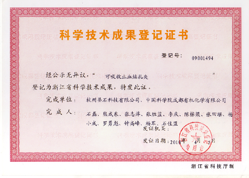 近日,我司研制產(chǎn)品“可吸收止血結(jié)扎夾”獲得浙江省科技廳頒發(fā)的科學(xué)技術(shù)成果登記證書。這一證書的獲得,標(biāo)致著該產(chǎn)品已得到了省級政府部門的認(rèn)可,此舉為我司產(chǎn)品取得更高的榮譽(yù)奠定了堅(jiān)實(shí)的基礎(chǔ)。
