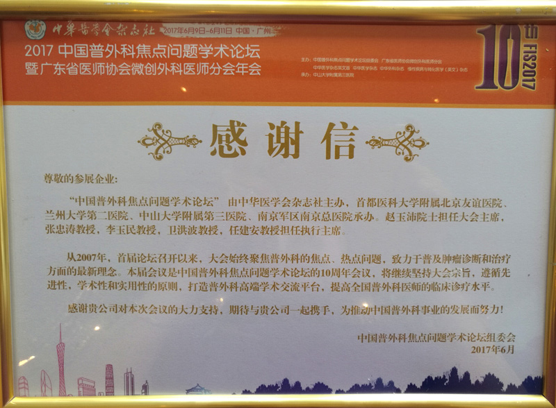 本次會議,我司參會人員積極配合主委會開展各項會務(wù)工作。因此,大會主辦方為我公司頒發(fā)了感謝信,這是對我們努力付出極大地認(rèn)可與肯定,我們將繼續(xù)努力,讓更多的人認(rèn)識了解我們的品牌,一起開創(chuàng)我國醫(yī)療事業(yè)更加美好的未來!